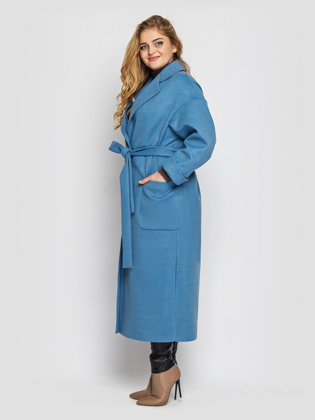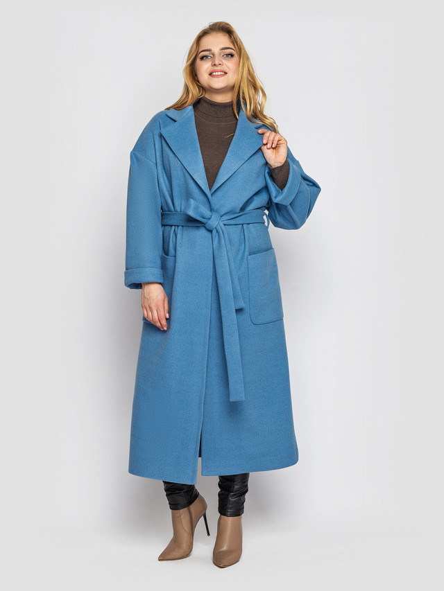 Пальто прямого вільного силуету, однобортне на 3 потайних кнопках. Щільний трикотажний кашемір, без підкладки. Довжина суперміді. Англійський стоячо-відкладний комір помірної величини. Рукав вільний із суцільнокроєним манжетом. Пройма спущена. Спереду накладні кишені. На спинці закритий центральний шов. У бічних швах петельки + знімний пояс. Також у бічних швах розрізи.